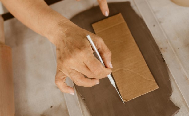 Cutting slabs happens with knife, needle tool, or potter's knife depending on precision needs. Straight edges use a ruler and knife. Curved shapes need templates cut from cardboard or plastic, then traced onto the clay with a needle tool. Clean cuts matter - dragged or rough edges don't join cleanly and create weak points in the finished form.