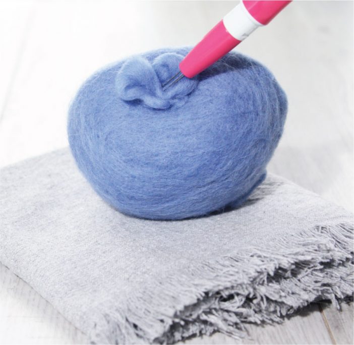Needle felting (or dry felting as it's sometimes known) is simply the process of tangling together loose fibers of wool roving with a barbed needle. By poking the fibers multiple times, they compact into a dense material that has structure and form.